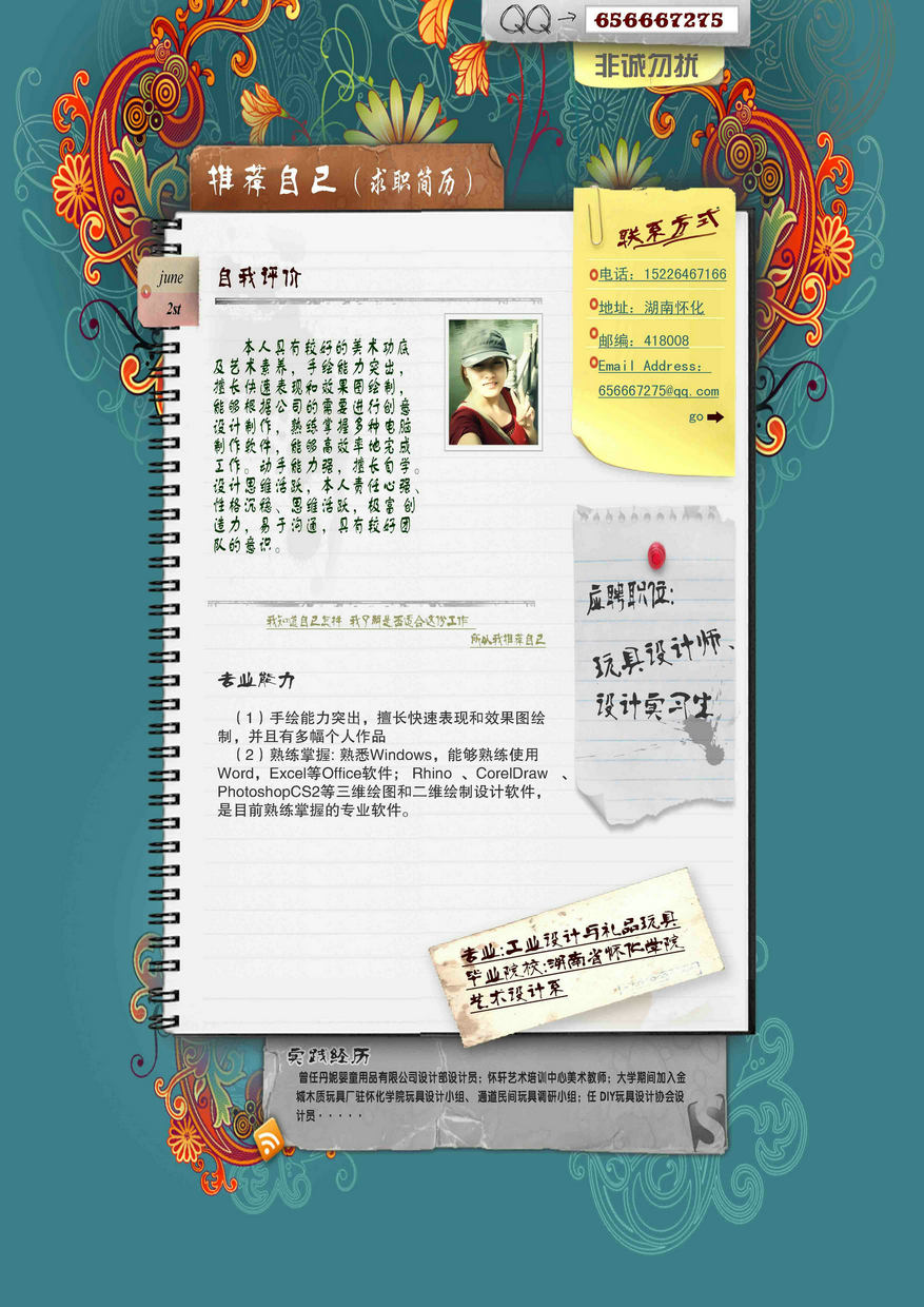 本人具有較好的美術(shù)功底及藝術(shù)素養(yǎng),手繪能力突出,擅長快速表現(xiàn)和效果圖繪制,能夠根據(jù)公司的需要進行創(chuàng)意設(shè)計制作,熟練掌握多種電腦制作軟件,能夠高效率地完成工作。動手能力強,擅長自學(xué)。設(shè)計思維活躍,本人責(zé)任心強、性格沉穩(wěn)、思維活躍,極富 創(chuàng)造力,易于溝通,具有較好團隊的意識。
