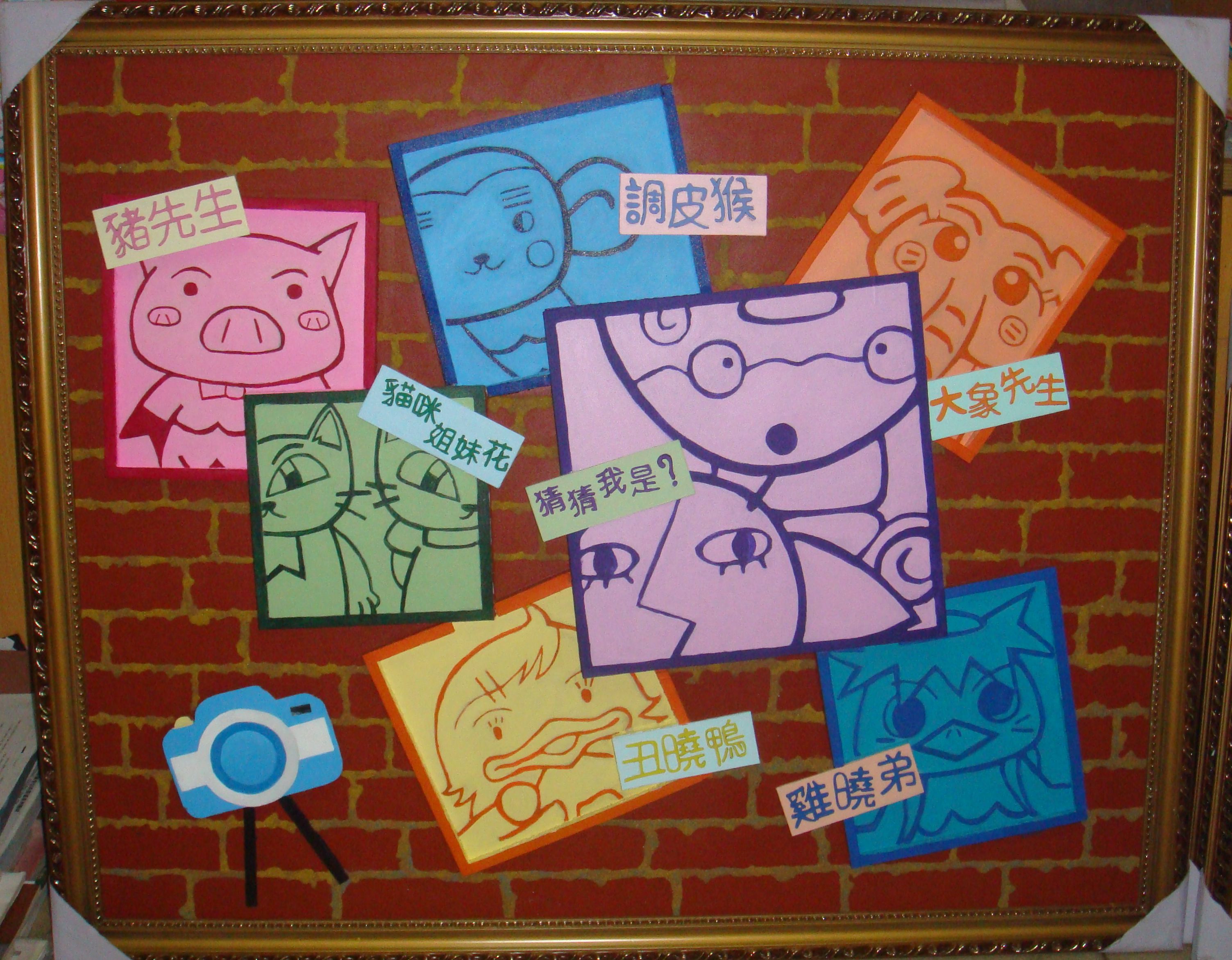 這幅畫我運用了大膽的想象,將動物的顏色夸張的來表現(xiàn)。整個畫面我都運用了色粉的效果。為了更加突顯照片墻的真實感,我將墻縫的線條改為用沙畫中的細沙來表現(xiàn),使其看上去更加的逼真。將動物們的相框掛在墻面上,并在畫面的左下角放置了一臺可愛的相機,來留住小動物們的可愛“笑容”。